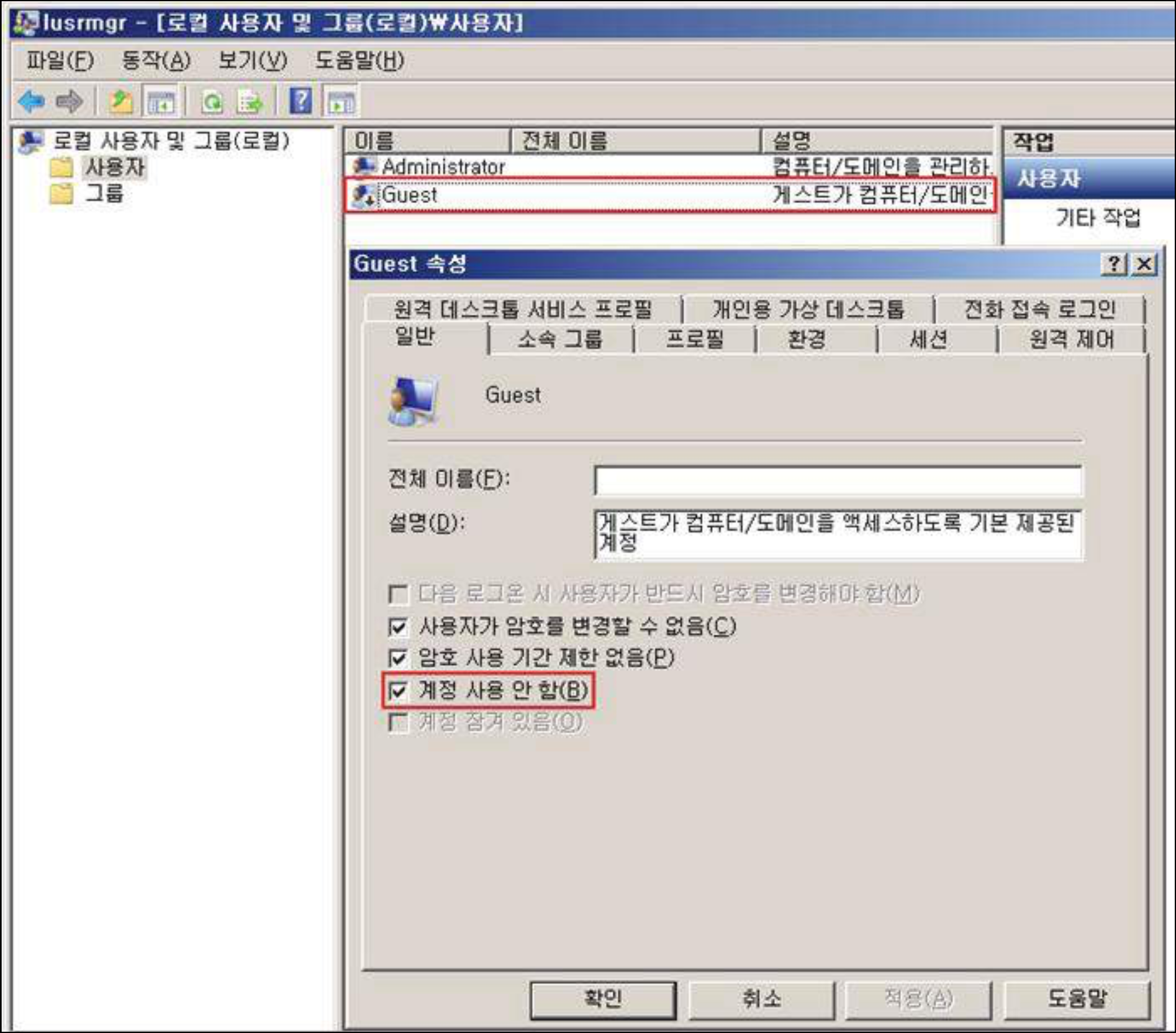 - 취약 : Guest 계정이 활성화 되어 있는 경우
