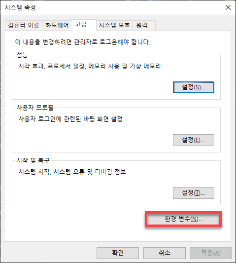 아래 환경 변수를 클릭해 줍니다