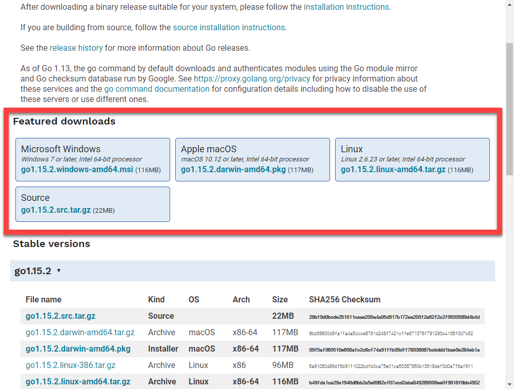 Downloads After downloading a binary release suitable for your system, please follow the installation instructions. If you are building from source, follow the source installation instructions. See the release history for more information about Go releases