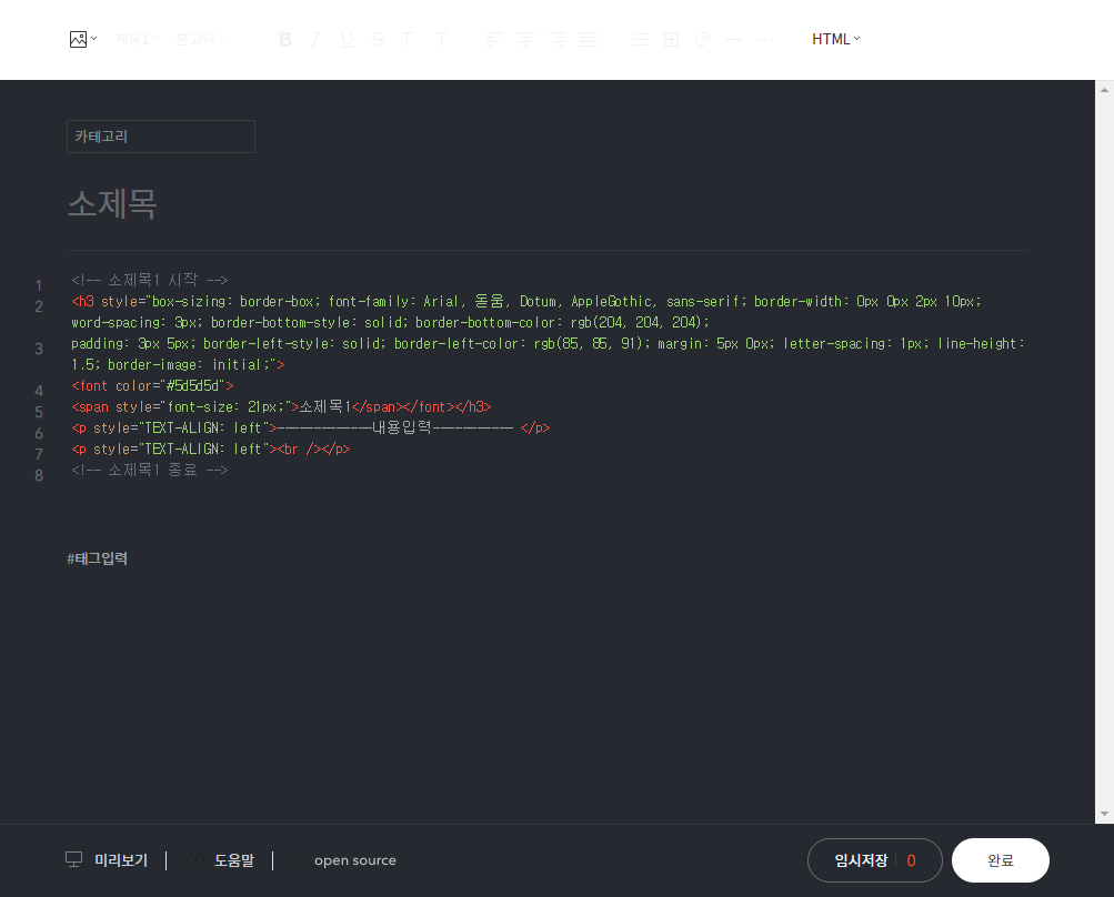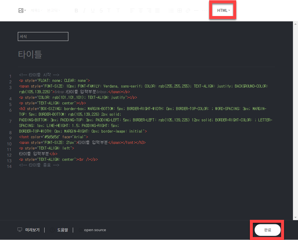 그 서식 중에 <!--***시작--> 부터 <!--***끝--> 이라고 되어 있는 부분까지 원하시는 서식을 복사해서 티스토리에 붙여 넣어주세요