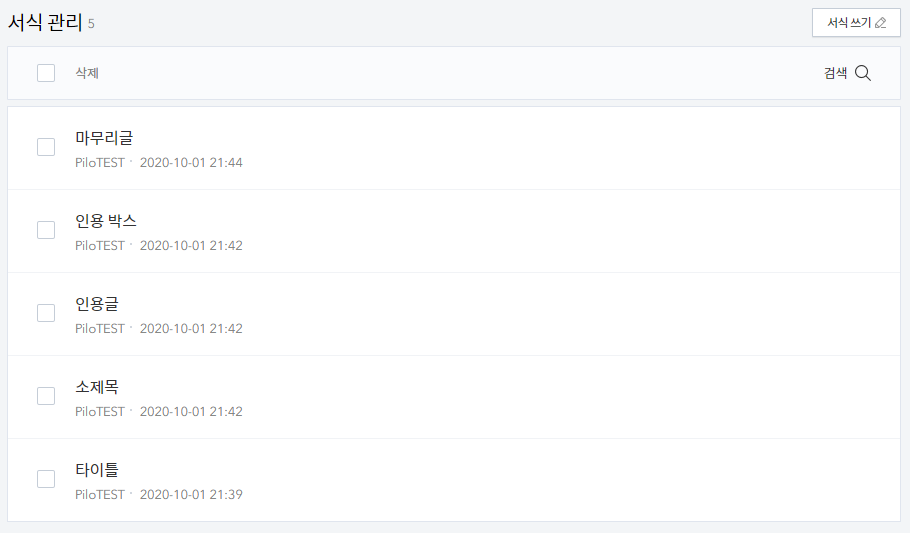 서식들을 만들고 나면 이렇게 서식관리에서 목록들을 볼 수 있어요