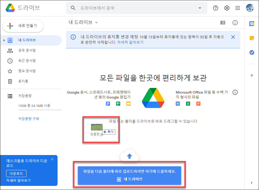 저 처럼 D&D를 해주시거나 왼쪽 상단에 "새로 만들기"에서 업로드를 해주세도 됩니다
