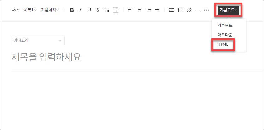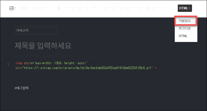 우측 상단에 기본모드를 HTML 로 바꿔주세요