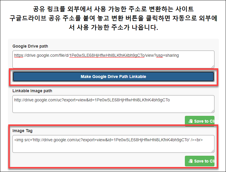 공유 링크를 외부에서 사용 가능한 주소로 변환하는 사이트 구글드라이브 공유 주소를 붙여 놓고 변환 버튼을 클릭하면 자동으로 외부에서 사용 가능한 주소가 나옵니다. Google Drive path Make