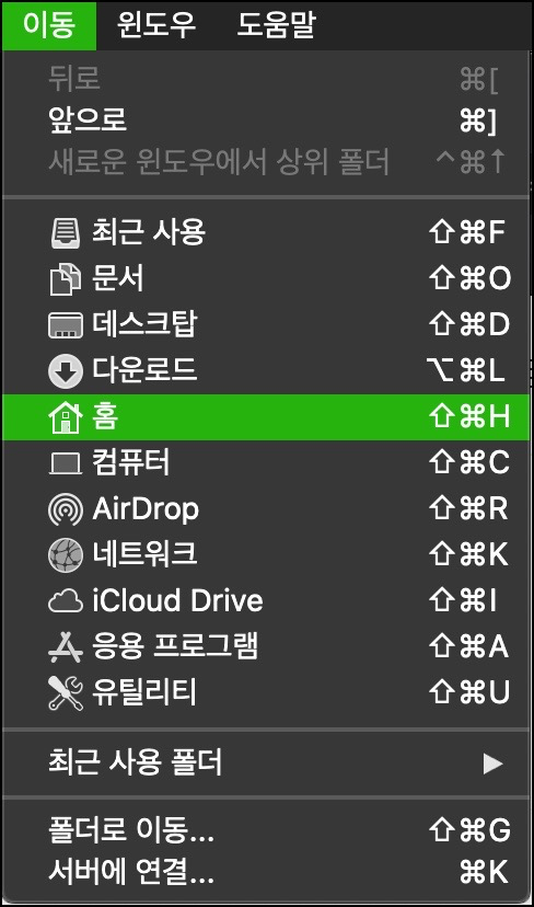 파인더를 띄운 뒤 메뉴바에서 이동을 찾으시면