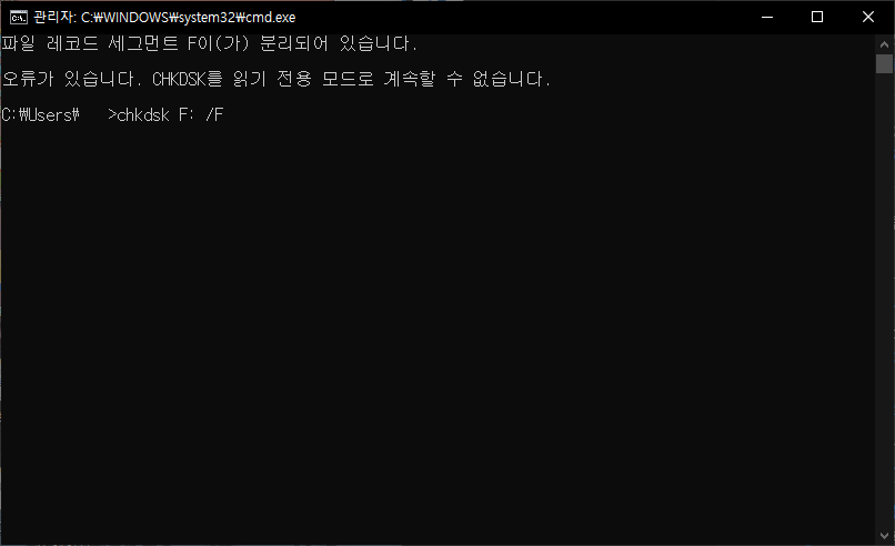 여기서 /F 옵션은 디스크에 오류가 있을 경우 자동으로 수정해 달라는 명령어예요