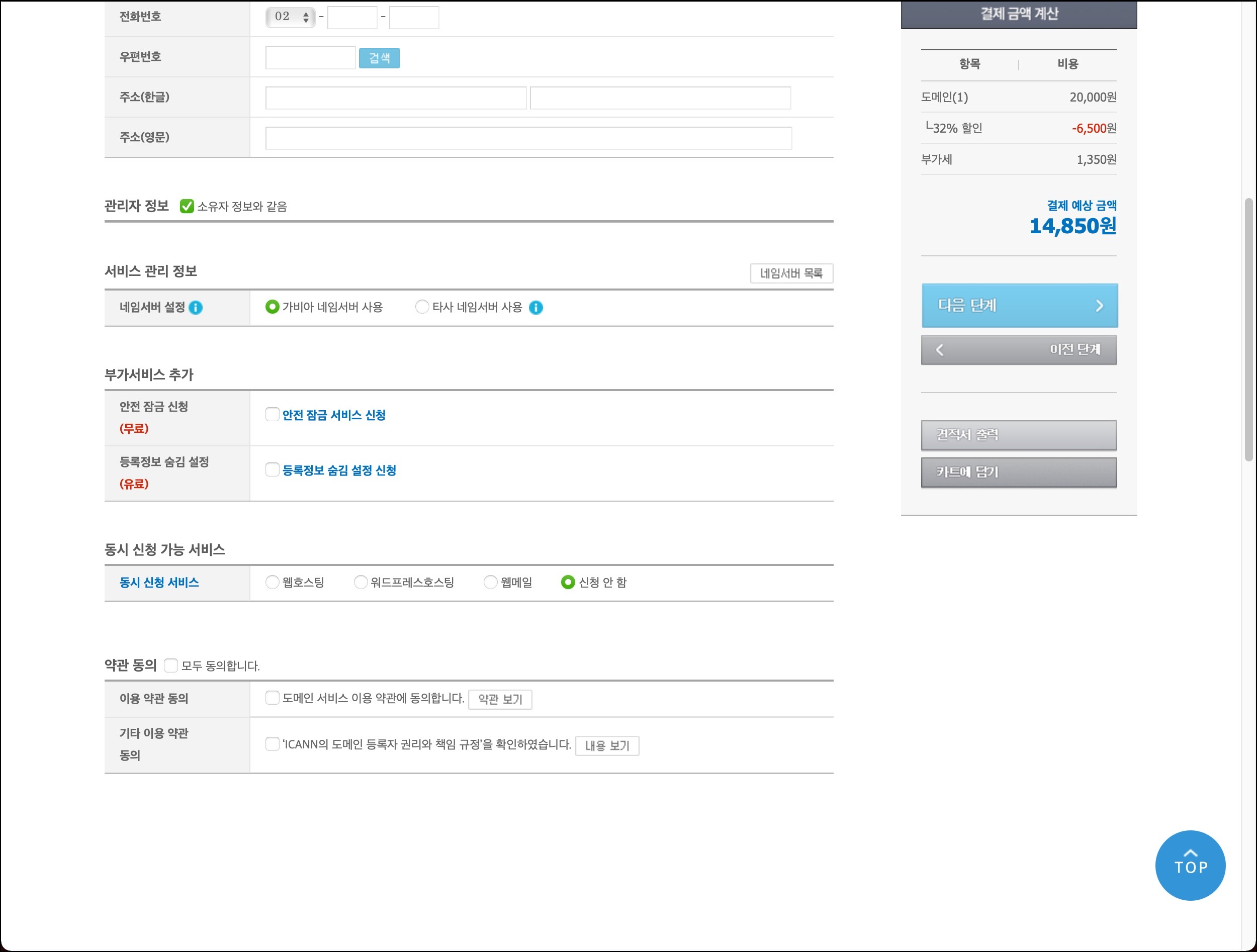 중요한건 여기서 입력한 이름, 주소 등은 도메인 검색을 통해 검색할 수 있는 부분이므로