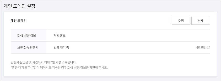 보안 접속 인증서 발급 대기중인데 이것은 보안에 더 좋은 HTTPS를 사용하기위한 인증서를 가비아에서 인증이 아직 안되어서 그래요