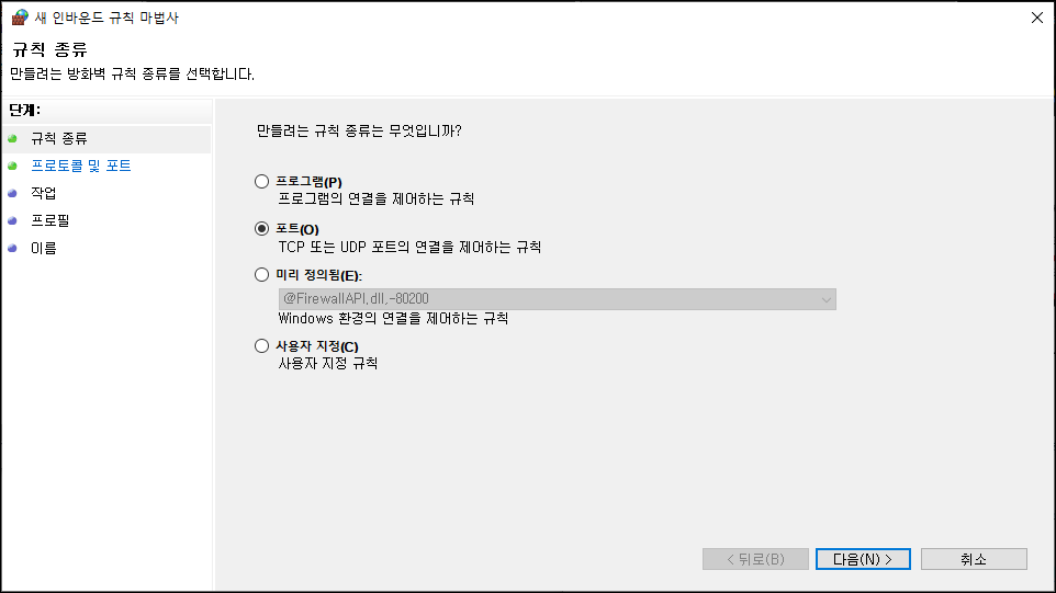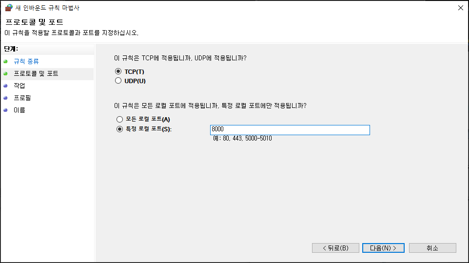 프로그램으로도 가능하지만 들어오는 TCP 8000 포트를 오픈 시켜줄 것이기 때문에