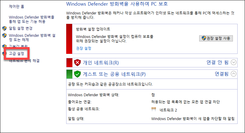 지금 사용하고 있는, 방화벽을 설정하고 있는 PC가