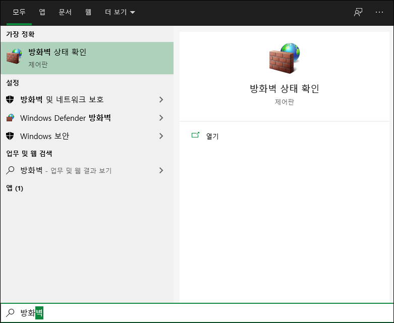 먼저 시작창에 방화벽을 검색해 주시면 저런 모양들이 나올텐데 아무거나 들어가셔도 됩니다