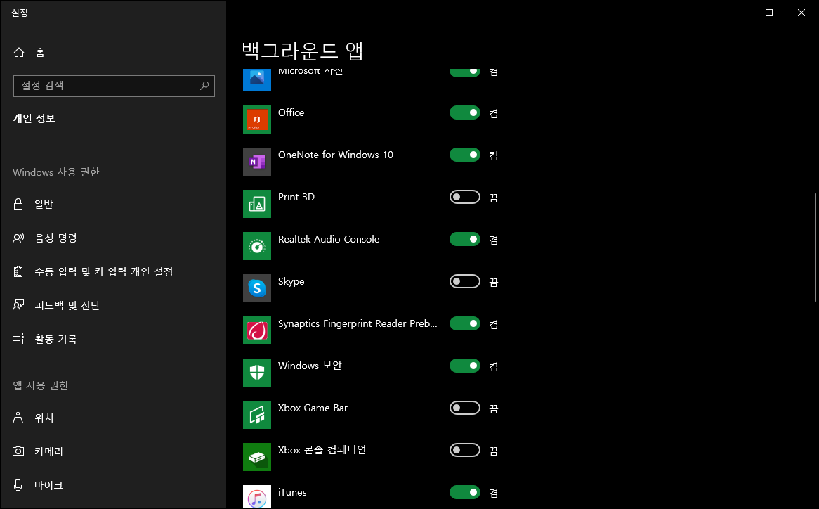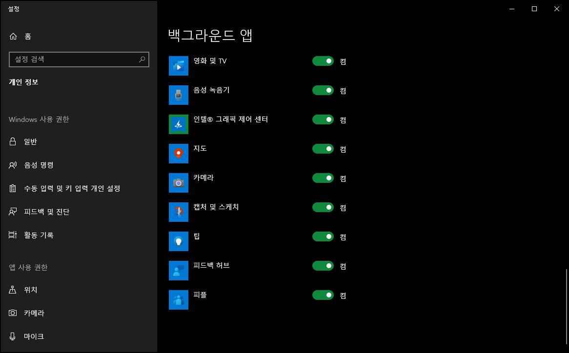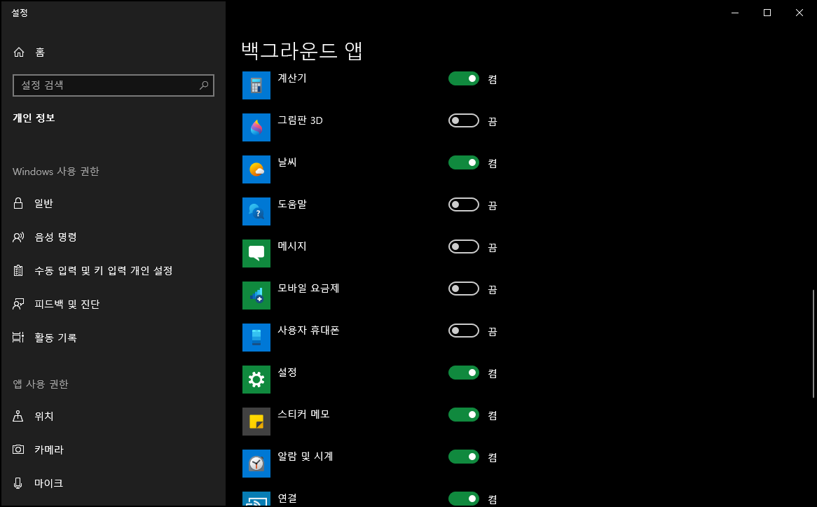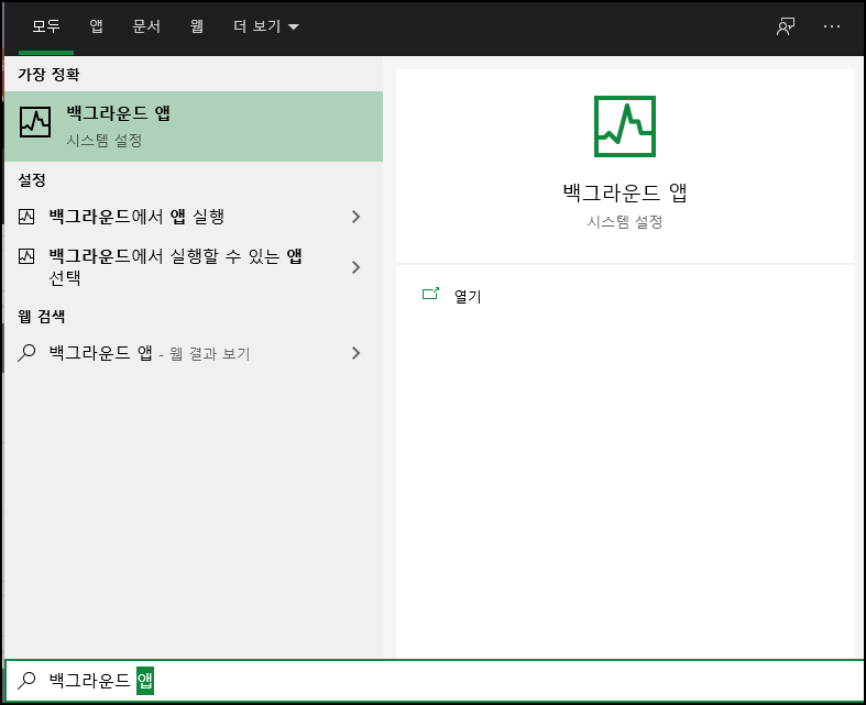 윈도우 검색창에 "백그라운드 앱" 을 검색해 주세요