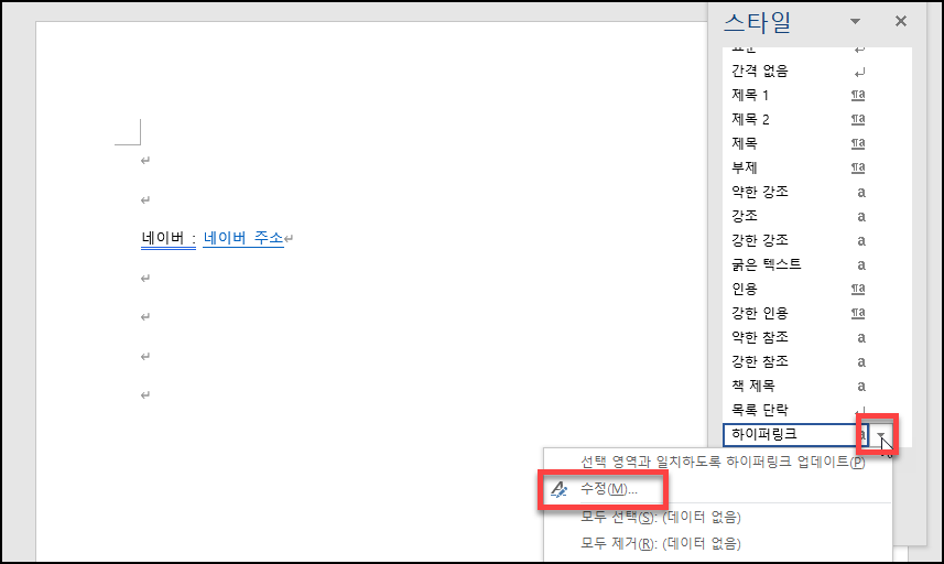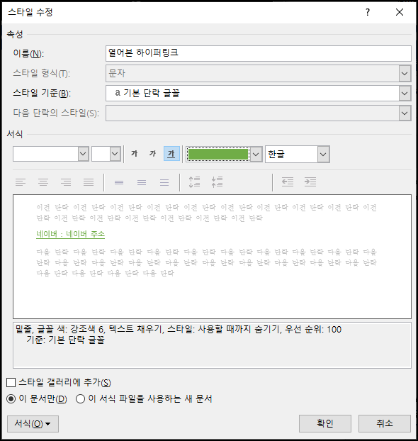 이 하이퍼링크라는 스타일을 수정해 줘야 합니다