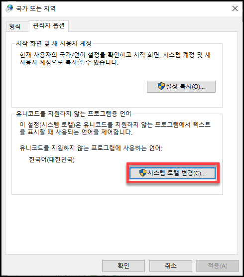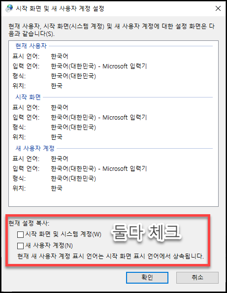 "설정 복사" 를 눌러 주시고 현재 시스템 로캘이 한국어로 되어 있는지 확인해 주세요