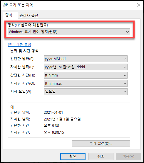 형식 : 한국어(대한민국) 으로 되어 있어야 합니다