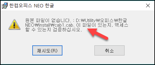 원본 파일이 없습니다. : D:\utility\오피스\한글*|install\cab1.cab 이 파일이 있는지, 액세스 할 수 있는지 검증하십시오.