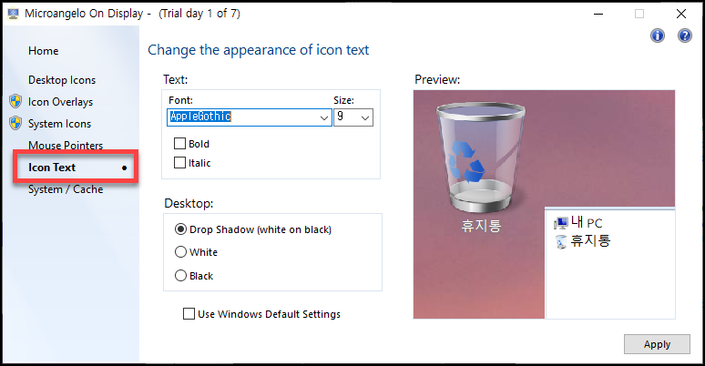바탕화면 아이콘 폰트도 설정된 것을 볼 수 있습니다