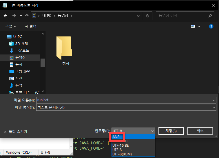 bat 파일을 저장하실 때는 인코딩을 ANSI 파일로 저장해서