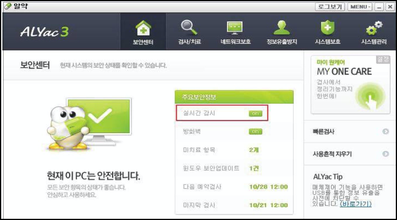 - 양호 : 섬치된 백신의 실시간 감지 기능이 활성화 되어 있는 경우