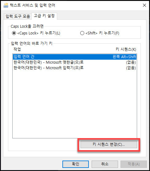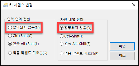 한글 입력이 안되요, 윈도우10 ctrl shift, alt shift 입력 언어 변경 해제 방법