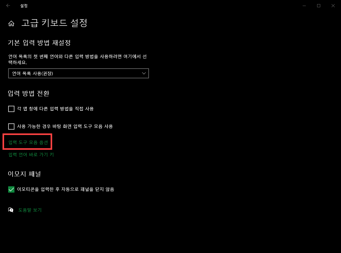 중간쯤에 "입력 도구 모음 옵션" 을 선택해 주세요