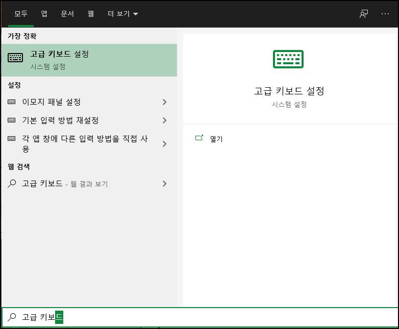 윈도우 키를 누르셔서 "고급 키보드 설정" 을