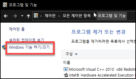 Windows 기능 켜기/끄기 를 클릭해 주세요