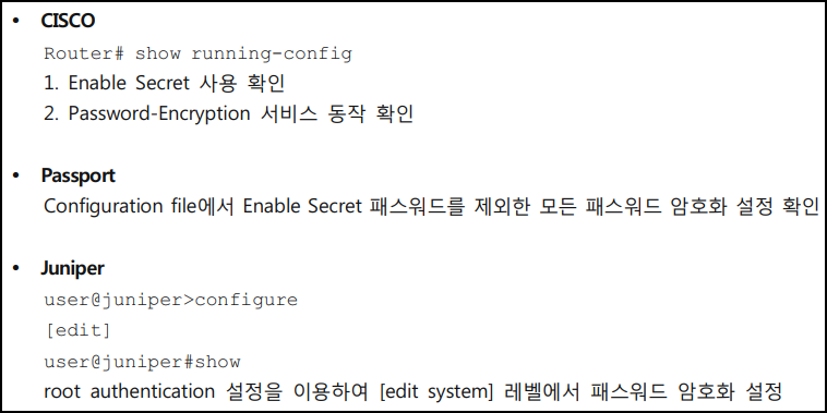 - 계정 패스워드 암호화 설정 유무를 점거하여 비인가자의 네트워크 장비 터미널 접근으로 인해 발생할 수 있는 장비 내 계정 패스워드 유출에 대비가 되어 있는지 확인하기 위함
