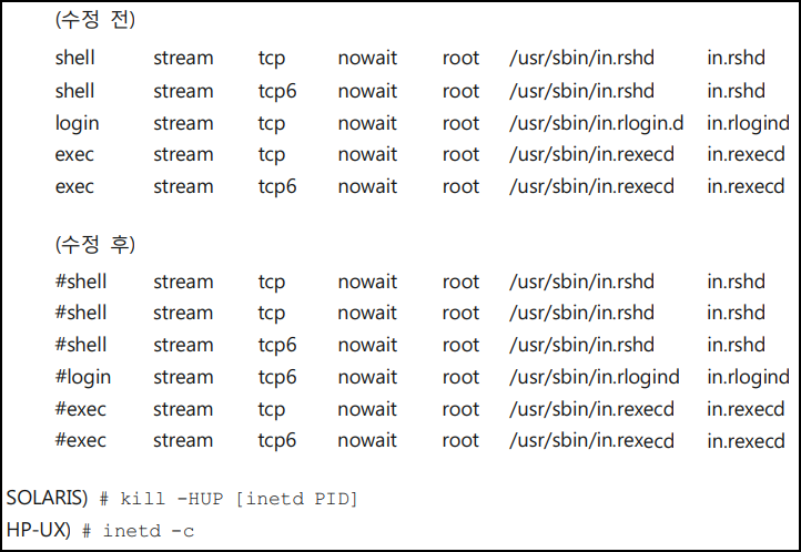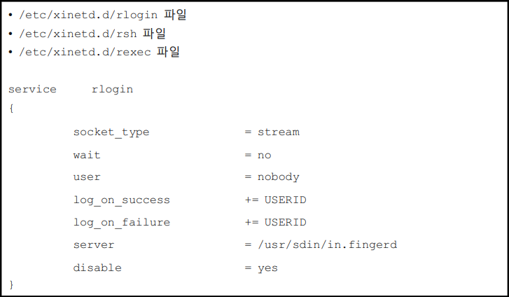 - 'r' command 사용을 통한 원격 접속은 NET Backup이나 다른 용도로 사용되기도 하나, 인증 없이 관리자 원격접속이 가능하여 이에 대한 보안위협을 방지하고자 함