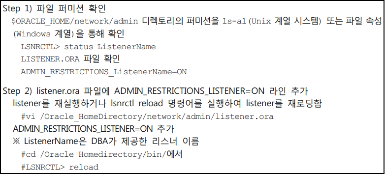 - 취약 : 리스너 관련 설정 파일에 대한 퍼미션이 일반 사용자로 설정되어 있고, 리스너로 파라미터를 변경할 수 없게 옵션 설정을 하지 않았을 경우