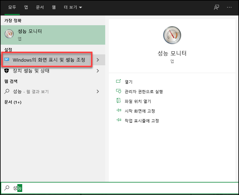 윈도우 검색창에 Windows의 화면 표시 및 성능 조절로 들어가 주세요
