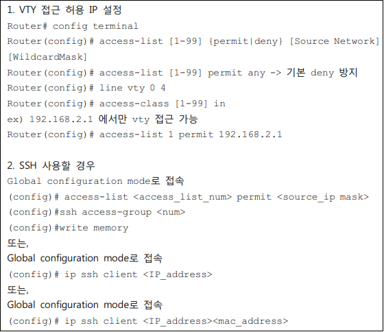 - 취약 : 원격 터미널(VTY) 접근 시 지정된 IP만 접근 하도록 설정이 되어 있지 않는 경우