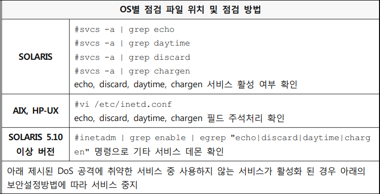 - 양호 : 사용하지 않는 DoS 공격에 취약한 서비스가 비활성화 된 경우