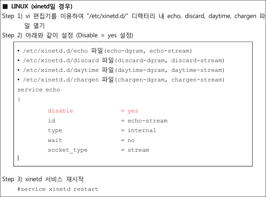 echo, discard, daytime, charge, ntp, dns, snmp 등 서비스 비활성화 설정