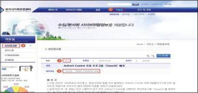 Step 1) 국가사이버안전센터 홈페이지 접속 > 자료실 > 보안권고문 > 121번 > 첨부파일 "Setup_CleanAX.exe" 다운로드 > 다운받은 "Setup_CleanAX.exe" 설치