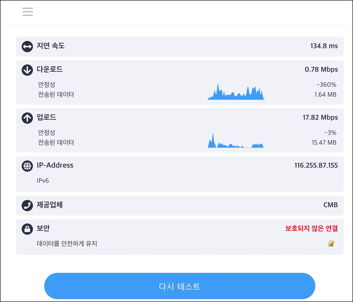 단점은 세부적인 다운로드/업로드 속도를 구분해서 측정이 어렵다는 것입니다