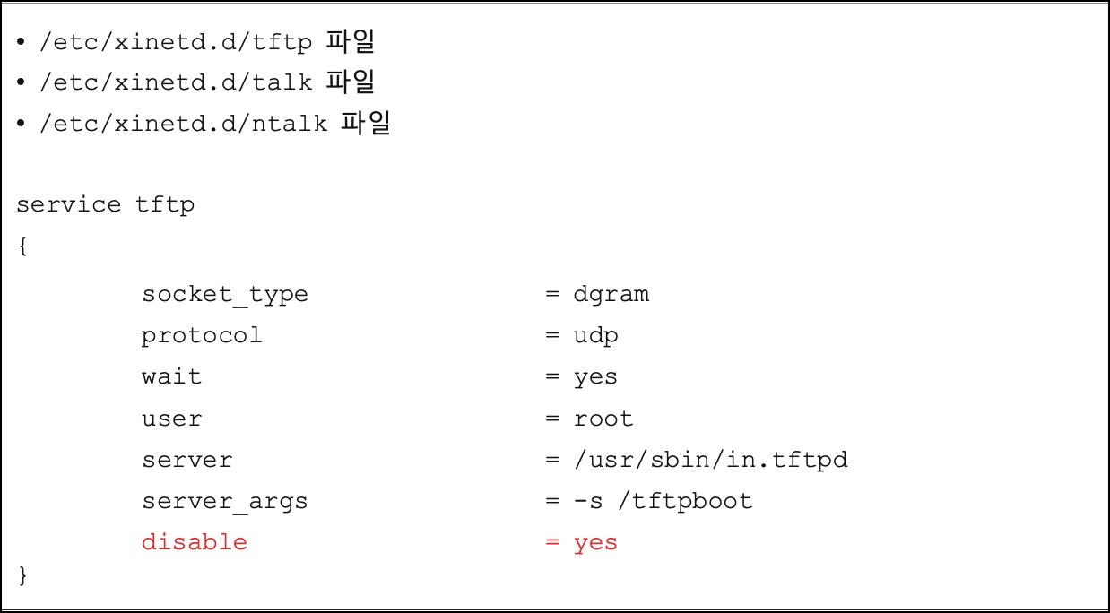 - 시스템 운영에 불필요한 서비스(tftp, talk, ntalk) 비활성화