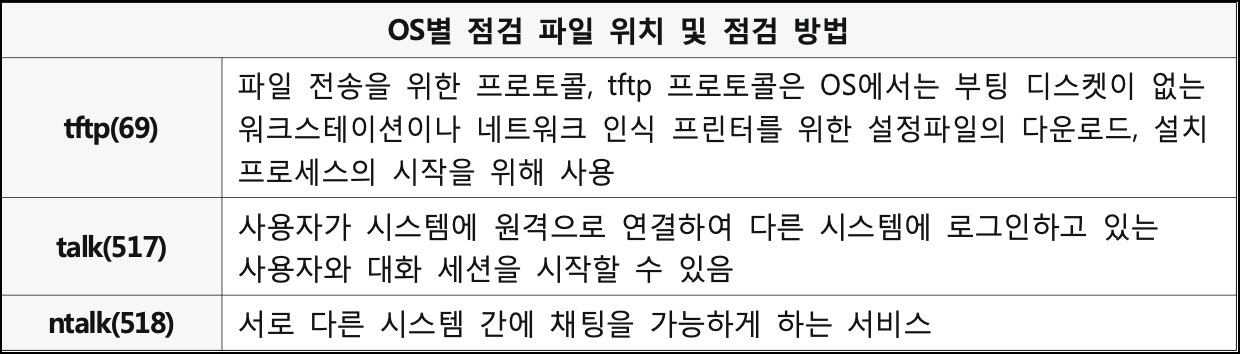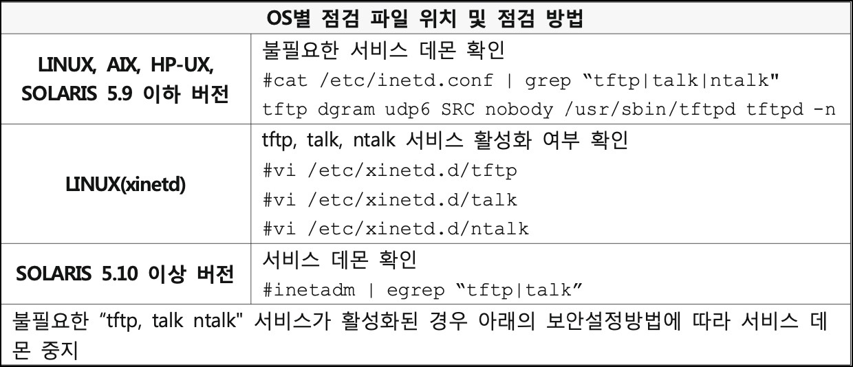 - 취약 : tftp, talk, ntalk 서비스가 활성화 되어 있는 경우