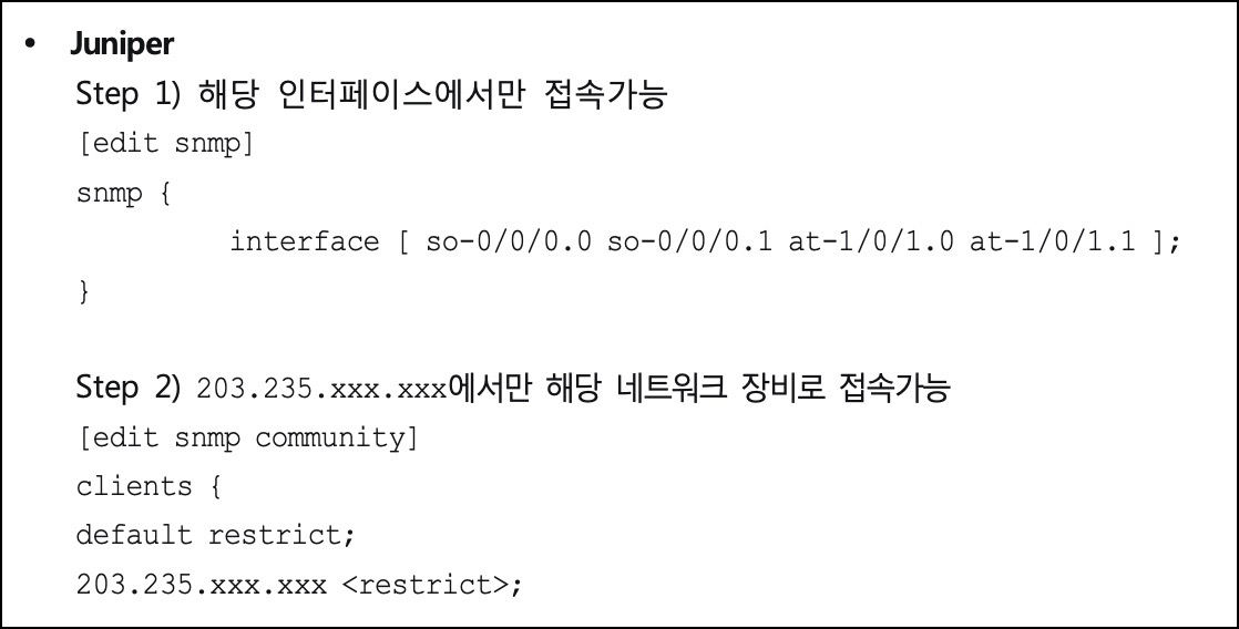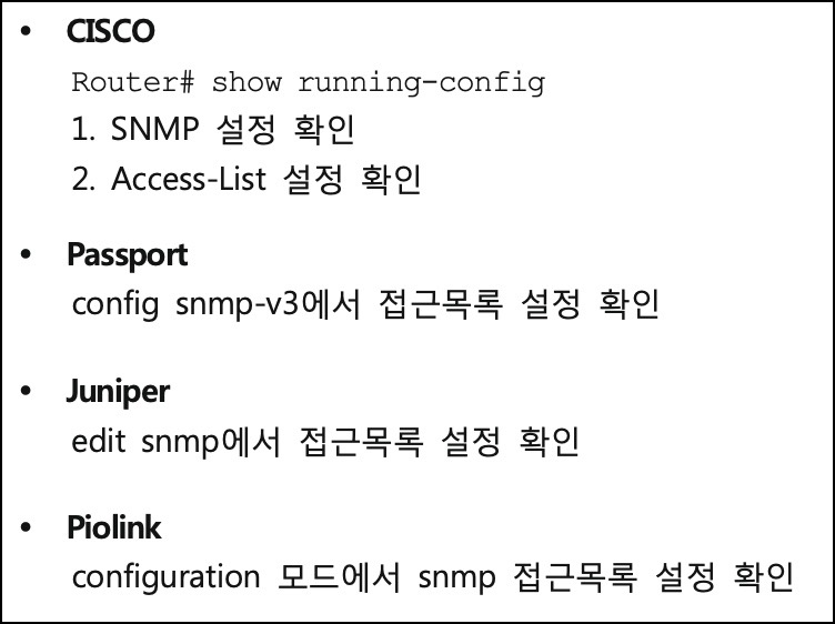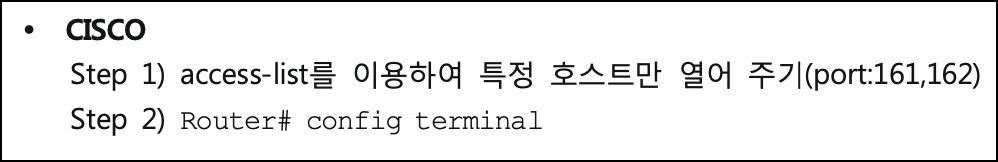 - 취약 : SNMP 접근에 대한 ACL 을 적용 하지 않은 경우