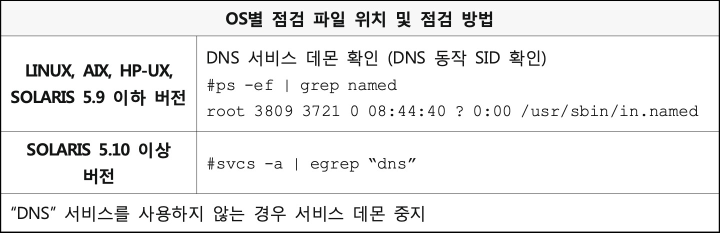 - DNS 서비스를 사용하지 않을 경우 서비스 중지, 사용한다면 DNS 설정을 통해 내부 Zone 파일을 임의의 외부 서버에서 전송 받지 못하게 하고, 아무나 쿼리 응답을 받을 수 없도록 수정