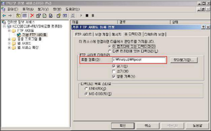 Step 1) 인터넷 정보 서비스(IIS) 관리 > FTP 사이트 > 해당 FTP 사이트 > 속성 > [홈 디렉토리] 탭에서 FTP 홈 디렉토리 확인