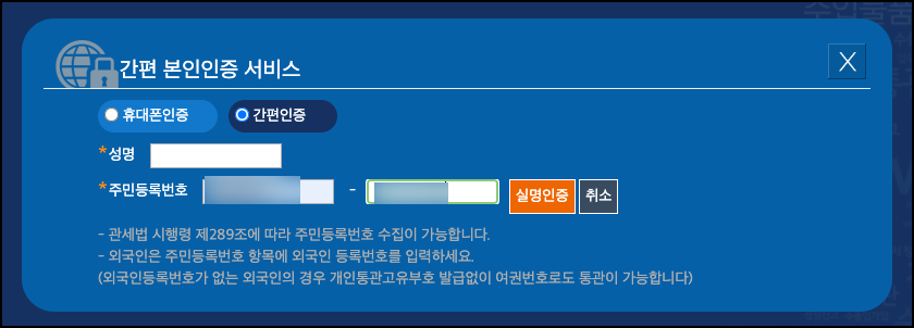 "개인통관고유부호발급"은 간단한 본인인증 후 이용 가능 합니다.