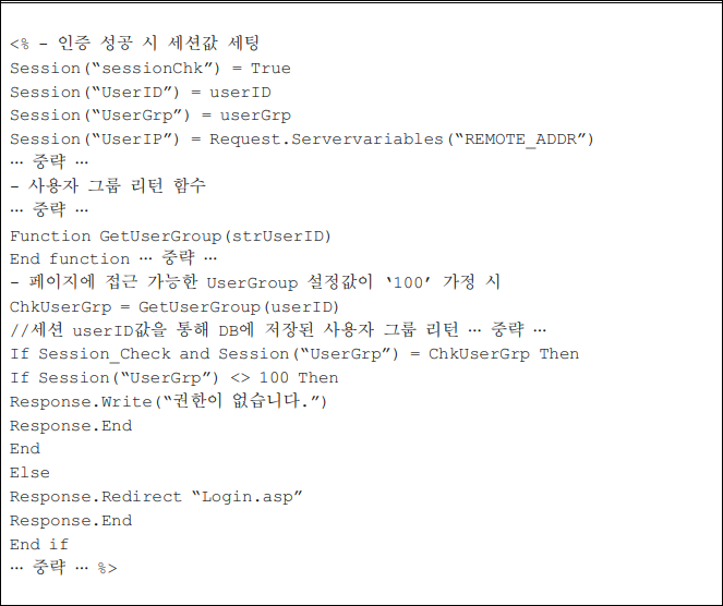 - 인증이 필요한 모든 페이지에 대해 유효 세션임을 확인하는 프로세스 및 주요 정보 페이지에 접근 요청자의 권한 검증 로직을 적용하여, 비인가자가 하위 URL 직접 접근, 스크립트 조작 등의 방법으로 중요한 페이지에 접근 시도 하는 것을 차단하기 위함