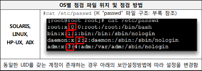 - UID가 동일한 사용자 계정을 점검함으로써 타 사용자 계정 소유의 파일 및 디 렉터리로의 악의적 접근 예방 및 침해사고 시 명확한 감사추적을 목적으로 함