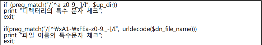 * 다운로드 애플리케이션 소스 파일을 수정하여 파일을 다운받을 수 있는 디렉터리를 특정 디렉터리로 한정하고 이 외의 다른 디렉터리에서는 파일을 다운받을 수 없도록 설정해야 함