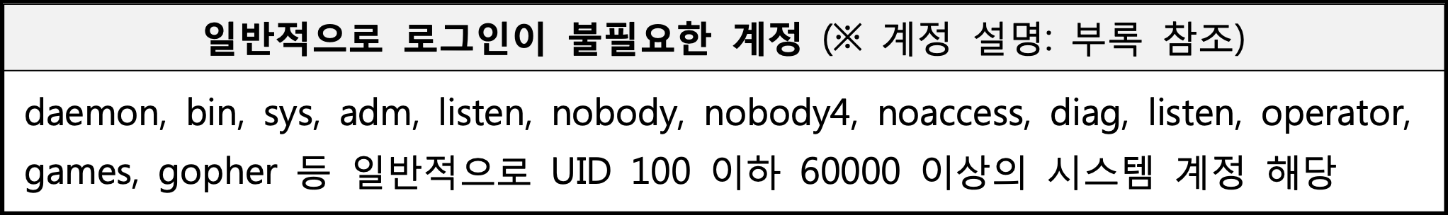 - 로그인이 불필요한 계정은 일반적으로 OS 설치 시 기본적으로 생성되는 계 정으로 쉘이 설정되어 있을 경우, 공격자는 기본 계정들을 이용하여 시스템 에 명령어를 실행 할 수 있음