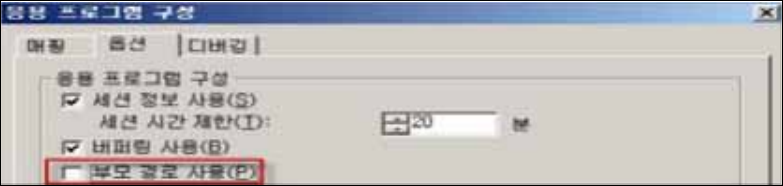 인터넷 정보서비스(IIS) 관리> [해당 웹 사이트]> [속성]> [홈 디렉터리]탭> [구성] 버튼 선택> [옵션] 탭에서 [부모 경로 사용] 체크 해제