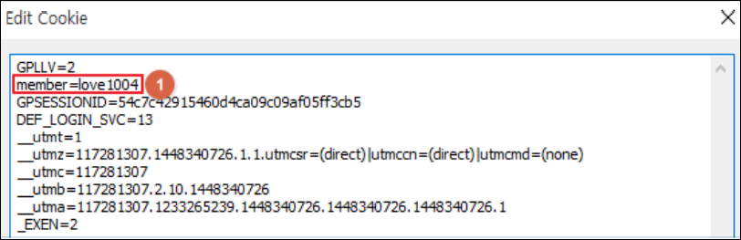 - 클라이언트에 전달되는 쿠키에 사용자 식별 값이 평문으로 노출될 경우 쿠키 변조를 통해 다른 사용자의 유효한 세션을 취득할 수 있으며, 기타 중요정보의 유출 및 변조 가능함