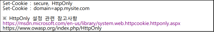 * HTTP 헤더에 아래와 같이 설정하여 세션 ID 값은 HTTPS를 통해서만 전송되도록 설정하고, 자바스크립트를 통해 세션 ID 값 등 쿠키 정보가 유출되지 않도록 보호