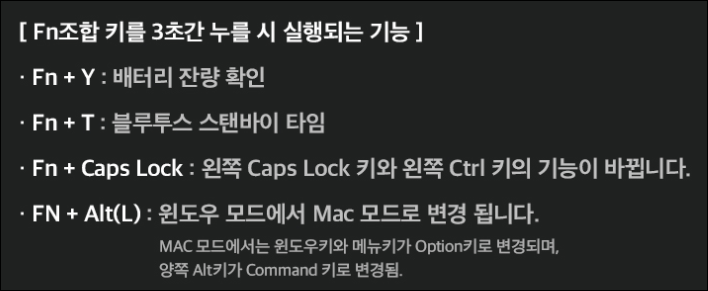 한번 충전하면 160시간까지 사용이 가능하다고 합니다. 저는 보통 케이블을 끼고 사용 중이라 시간은 잘 모르겠습니다. FN+Y 키를 3초간 누르고 있으면 배터리 잔량을 확인할 수 있습니다.